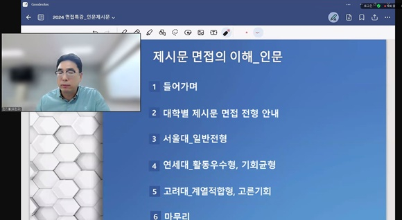 △16일은 경북지역 학생들이 가장 많이 접하게 될 ‘서류기반 면접 준비 방법’을 주제로 진행하며 △17일은 ‘자연 제시문 기반 면접 준비 방법’을 △18일은‘인문 제시문 기반 면접 준비 방법’을 주제로 수험생들이 1주일 안에 다양한 면접 유형을 집중적으로 대비할 수 있도록 구성되었다.