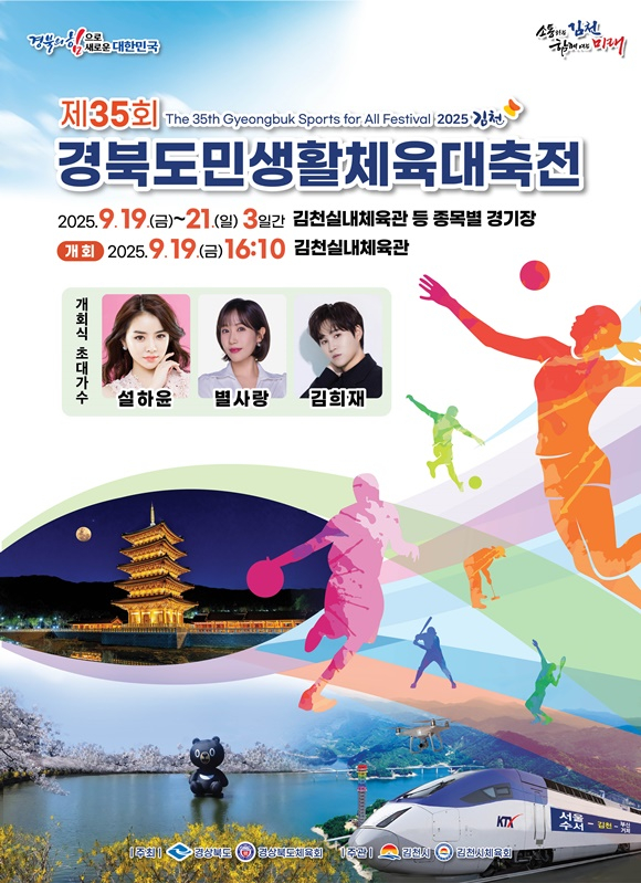 김천시는 9월 19일부터 21일까지 3일간 김천실내체육관 및 각 종목별 경기장에서 경북 생활체육 동호인들의 우정과 화합을 다지는 ‘제35회 경북도민생활체육대축전’이 열릴 예정이다.