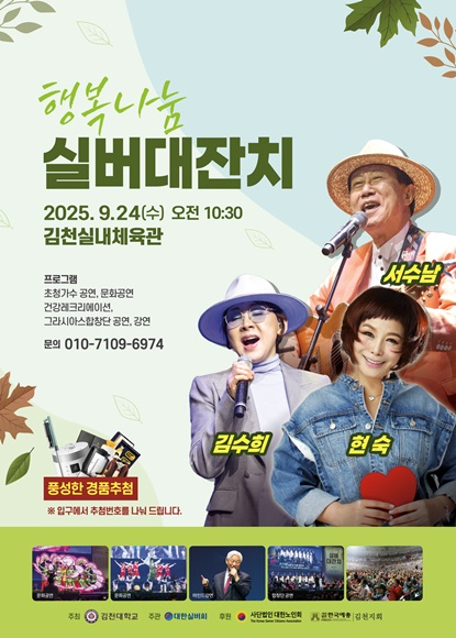 김천대학교는 오는 2025년 9월 24일(수) 오전 10시 30분, 김천실내체육관에서 지역 어르신 약 5,000여 명을 대상으로 ‘2025 행복나눔 실버 대잔치’를 개최한다고 밝혔다.