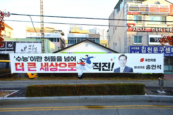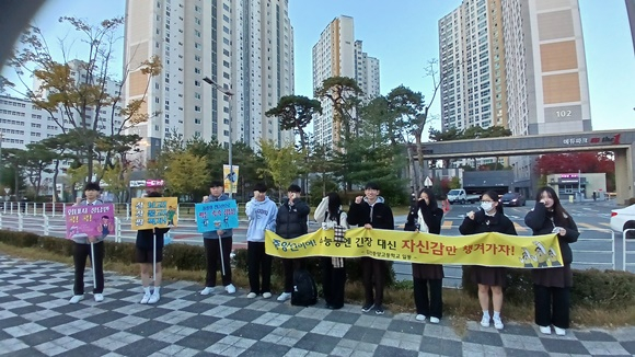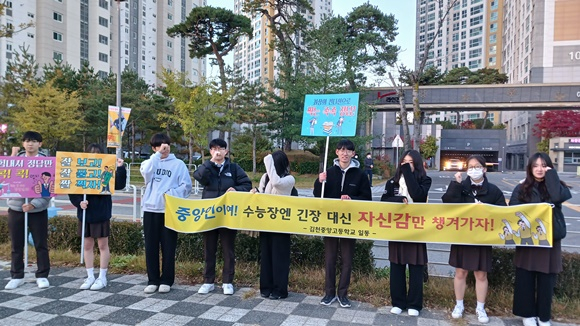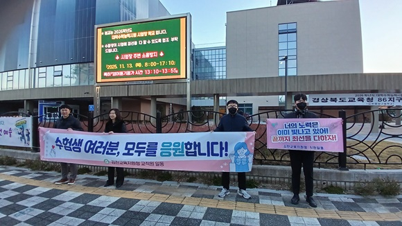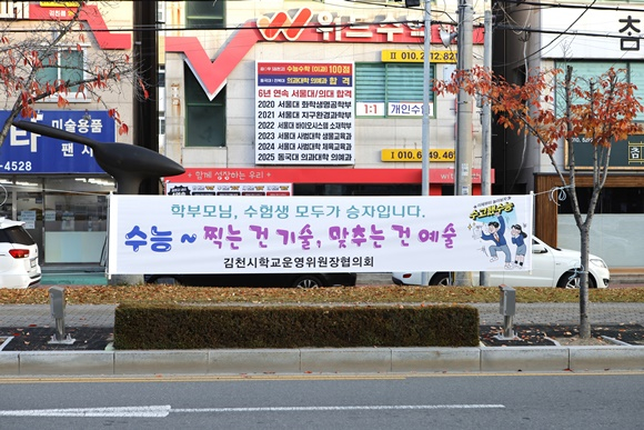 김천의 한 시험장 앞에서는 “이제 시작이다. 끝까지 힘내라!”는 응원 문구가 적힌 플래카드가 바람에 펄럭이고 있다.