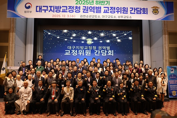 대구지방교정청은(청장 직무대리 조형근)은 12월 3일(수) 구미 호텔금오산에서 김천소년교도소 전상현 교정협의회장 등 120여 명의 교정참여인사가 참석한 가운데 2025년 하반기 권역별 교정위원 간담회 행사를 주재하여 법무부장관 표창을 전수하고, 평소 수용자교정교화를 위해 헌신해 온 교정참여 인사들의 노고에 감사를 전하였다.