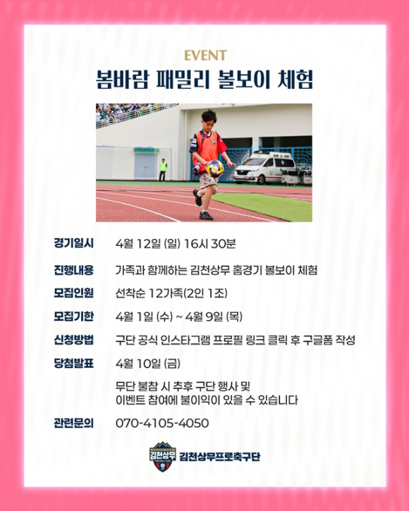 흩날린 벚꽃의 아쉬움을 채우는 홈경기 이벤트!김천상무는 오는 홈경기 완연한 봄을 알리는 이벤트로 홈팬을 맞이한다. 먼저 선수들과 함께하는 봄소풍 이벤트가 열린다. 사전 모집된 총 30팀을 대상으로 진행되며, 선수들과 함께하는 포토타임, 피크닉 세트 증정, 레크리에이션을 즐길 수 있다. 신청 마감은 4월 8일까지다. 이어 4월 9일까지 구단 SNS를 통해 신청 시 패밀리 볼보이 체험, 봄 Kick Off 가족 시축, 패밀리 에스코트 등 다양한 이벤트에 참여할 수 있다.