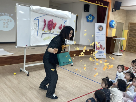 이번 행사는 그림책 『고구마구마』라는 작품을 작가님의 1인 연극 공연으로 관람하였고, 공연을 통해 그림책 속 이야기를 생생하게 전달받을 수 있었다. 1인 연극 공연 후에는 그림책 속 궁금한 점을 유아들과 함께 이야기 나누는 시간을 가졌다.