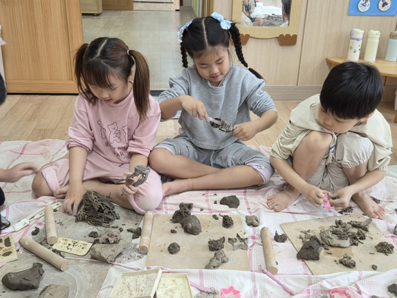아이들은 조물조물 흙을 만지며 촉감과 색깔, 성질을 직접 탐색하는 시간을 가졌다. 손으로 느끼는 부드러움과 거칠음, 흙의 다양한 변화 과정을 경험하며 오감을 자극 받았다. 또 흙을 밟아보며 형태를 만들고, 형님과 동생이 함께 다양한 구조물을 구성하는 활동도 진행되었다. 아이들은 자유로운 상상력을 바탕으로 형태를 빚으며 표현력과 집중력을 보여주었다. 더불어 물레빚기 체험을 통해 흙이 회전하며 형태가 만들어지는 과정을 관찰하고, 직접 작품을 완성해보는 특별한 경험도 해보았다.