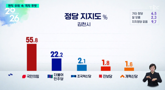 김천시 정당 지지도 조사 결과, 국민의힘이 55.8%로 가장 높은 지지를 받았으며, 더불어민주당은 22.2%로 뒤를 이었다. 이어 조국혁신당 2.1%, 진보당 1.8%로 나타났다.