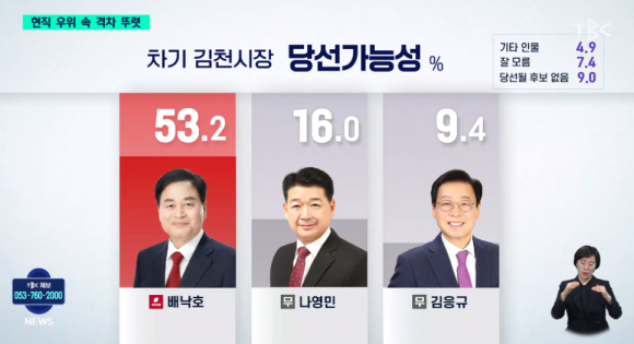 국민의힘 공천을 받은 현직 시장에 맞서 무소속 후보 2명이 출마한 가운데, 차기 김천시장 지지도 조사 결과도 함께 발표됐다.