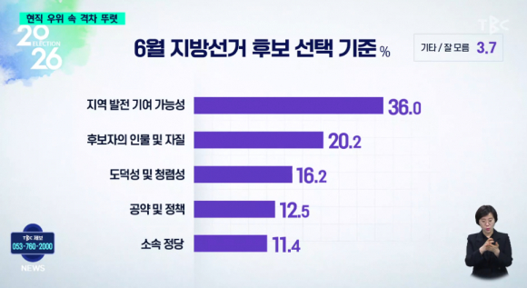 후보 선택 기준으로는 ‘지역 발전 기여 가능성’이 36.0%로 가장 높게 나타났다. 이어 ‘인물 및 자질’(20.2%), ‘도덕성·청렴성’ (16.2%)이 주요 판단 기준으로 꼽히며 뒤를 이었다.