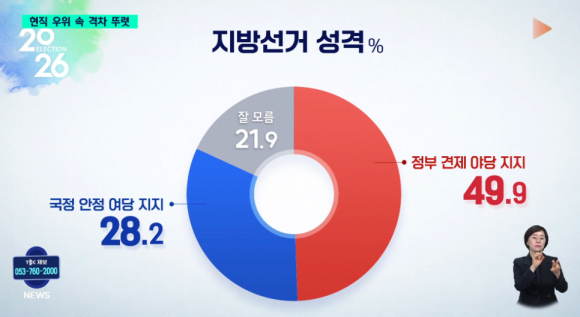 지방선거의 성격과 관련해서는 정부를 견제해야 한다는 야당 지지 응답이 49.9%로 나타났으며, 국정 안정을 위해 여당을 지지해야 한다는 의견보다 20% 포인트 이상 높은 것으로 조사됐다.
