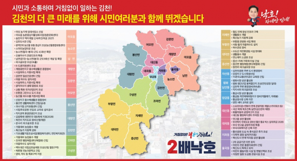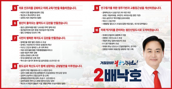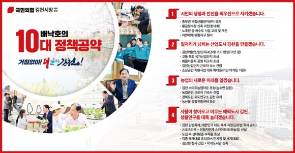 이와 함께 읍·면·동별 공약도 제시됐다. 배 후보는 아포·율곡권에는 도서관과 의료·교육 인프라를 확충하고, 농소·어모 일대에는 스마트농업과 산업단지를 연계한 성장축을 구축하겠다고 밝혔다. 또한 원도심인 평화·양금·대신동 일대에는 도시재생과 상권 활성화를 추진하고, 지례·부항·대덕 등 산간지역은 관광과 생활SOC 확충을 통해 균형발전을 이루겠다는 계획이다.